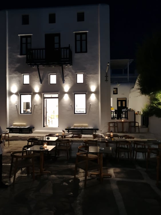 Parthenis Cafe βρίσκετε εξωτερικά στον χώρο του ιστορικού καταστήματος Parthenis, στο πιο θρυλικό σημείο της Μυκόνου, δίπλα στους ανεμόμυλους.