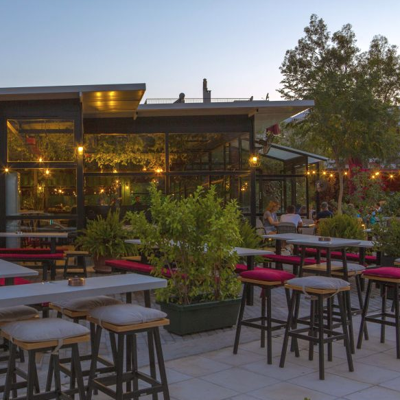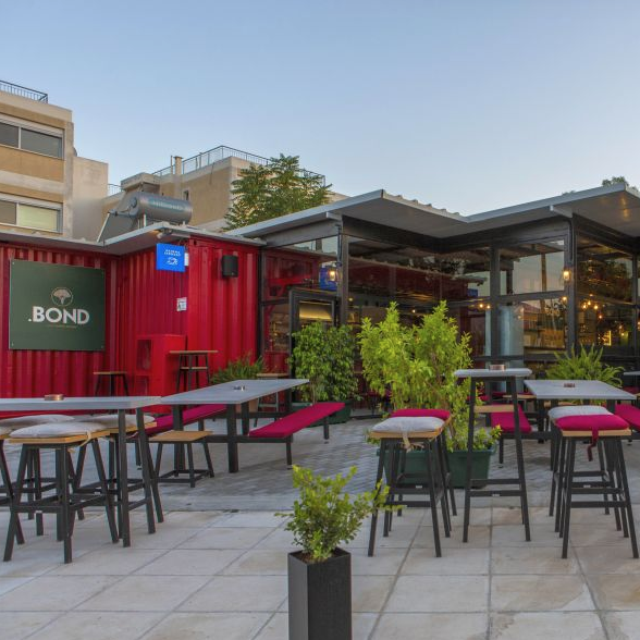 Η μεγάλη αυλή του Bond είναι στην ουσία μια ολόκληρη εξοχή γεμάτη τριανταφυλλιές, αναρριχώμενα γιασεμιά και κισσούς, μυρωδάτους βασιλικούς και φουντωμένους δυόσμους. Είναι ένα στέκι για όλες τις ώρες καθώς από το πρωί μπορείτε να απολαύσετε ποιοτικό καφέ συνοδευόμενο από χειροποίητες λιχουδιές και θρεπτικά πιάτα με ισορροπημένες αναλογίες και ποικιλία από super foods, συνεχίζοντας έως το βράδυ και να επιλέξετε το γεύμα σας από ένα βασισμένο στην ελληνική-μοντέρνα κουζίνα μενού. Πλούσια κάβα και ανατρεπτικά κοκτέϊλς.