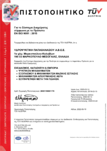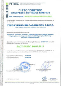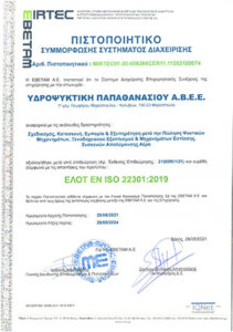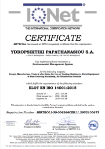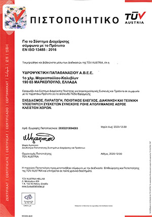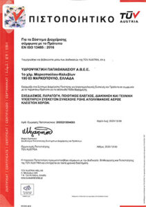 Μέσω των διαδικασιών της TUV AUSTRIA, της ΕΒΕΤΑΜ/MIRTEC, και της IQNET πιστοποιείται ότι η εταιρεία ΥΔΡΟΨΥΚΤΙΚΗ ΠΑΠΑΘΑΝΑΣΙΟΥ ΑΕΒΕ είναι εναρμονισμένη με τα πρότυπα EN ISO 9001:2015, ISO 13485:2016, ISO 14001:2015 και ISO 22301:2012.